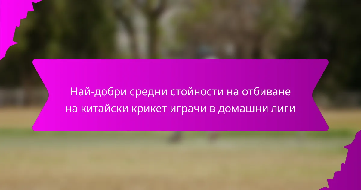 Най-добрите средни стойности на отбивите на китайските играчи по крикет в домашните лиги варират, като някои играчи постигат впечатляващи цифри, които отразяват техните умения и последователност. Обикновено, средните стойности могат да варират от ниските двадесет до високите тридесет, в зависимост от опита на играча и конкурентното ниво на лигата.